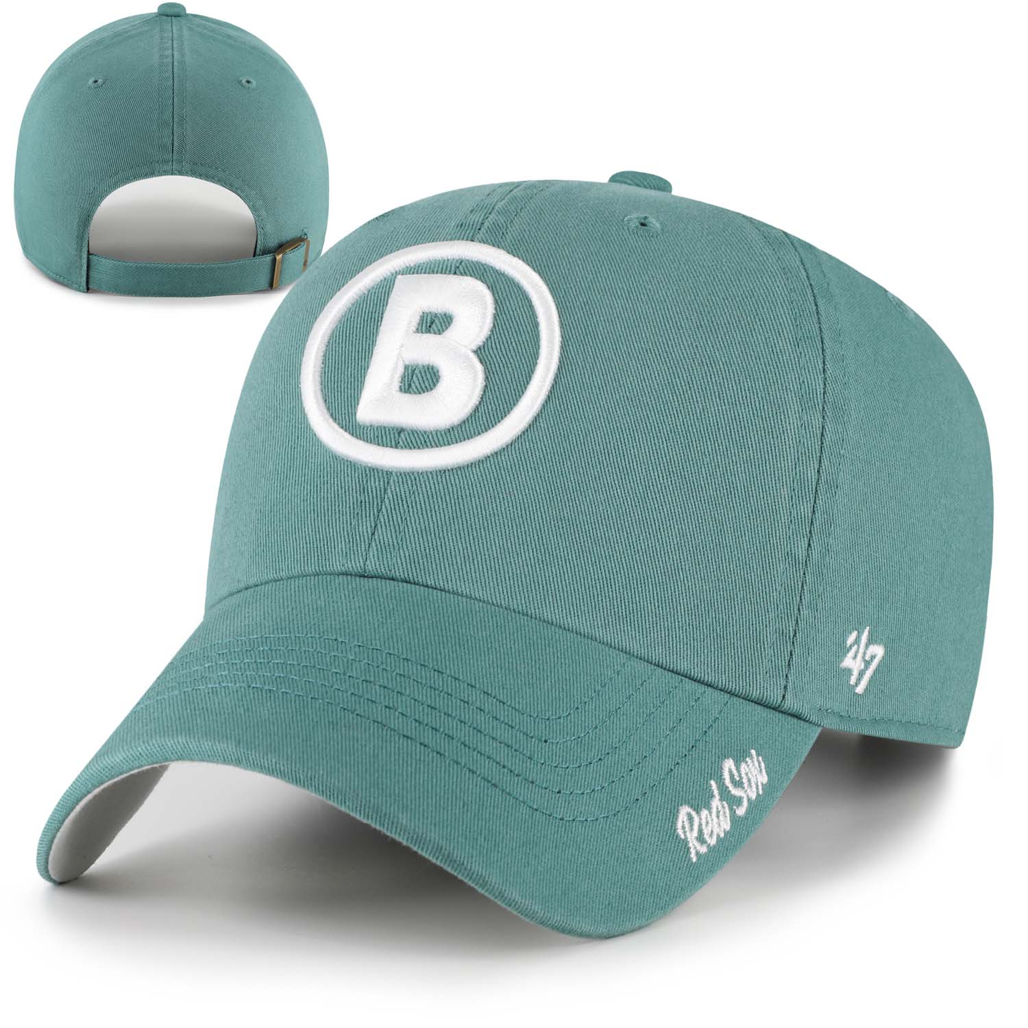 Ladies Boston Red Sox 47 Clean-Up - 25 City Connect - Miata - Green. relaxed fit hat with Red Sox raised embroidery B logo script Red Sox on the brim. Classy hat for the classic Lady Red Sox fan. 100% garment washed cotton cap for a broken-in look and feel. One size fits all. Cloth adjustable strap.