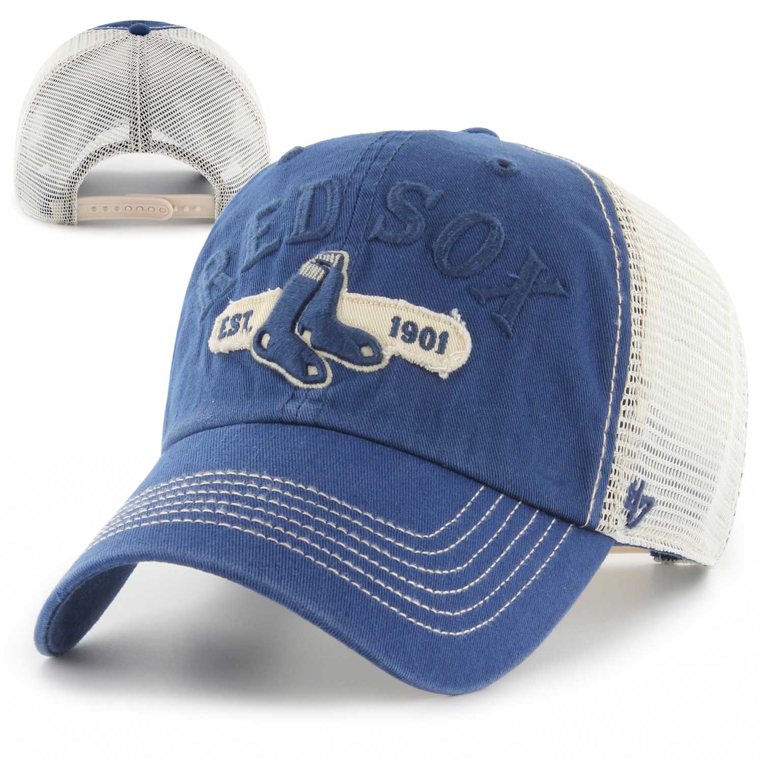 Boston Red Sox 47 Clean-Up - Blazer - Riverbank. Red Sox blue relaxed fit hat with a Red Sox logos embroidered with a mesh back, this hat is 100% garment washed cotton for a broken-in look and feel. This hat has a plastic snapback adjustable strap and is one size fits all.