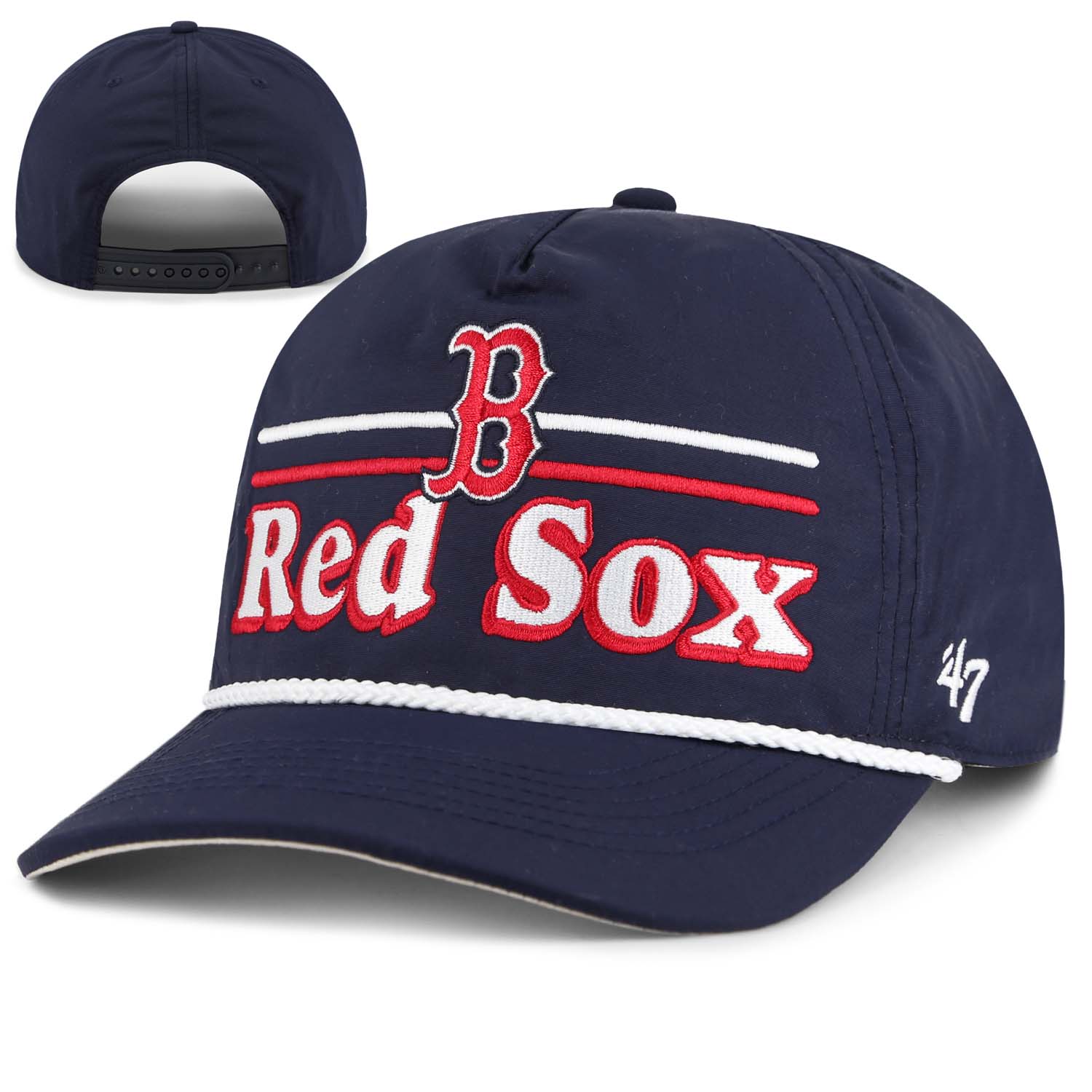 Boston Red Sox 47 Hitch - Campscape - Navy. The Campscape Collection includes outdoor-inspired styles crafted from rugged nylon with the look of old-school camping gear. The '47 HITCH RF (relaxed fit) is a relaxed-fit version of our popular '47 HITCH style. A curved adjustable with flat embroidery on the front and a plastic snapback closure. Made from nylon.