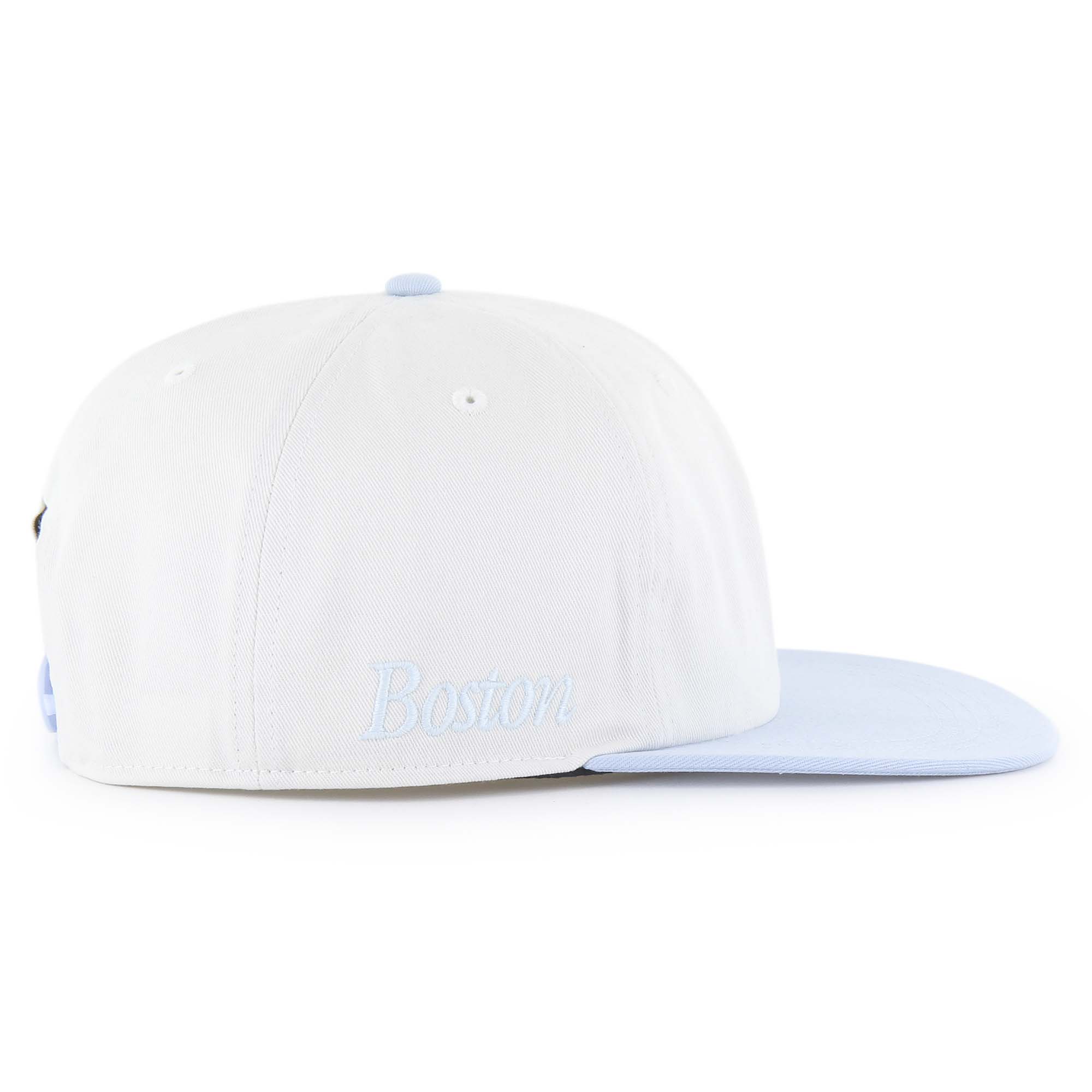 Boston Red Sox 47 Snapback - Foundation Captain - Ice Cap. ’47 CAPTAIN RL is relaxed-fit, flat-brim snapback in khaki constructed from brushed light canvas with half-raised embroidered and appliquéd team logos, a flat embroidered city side hit