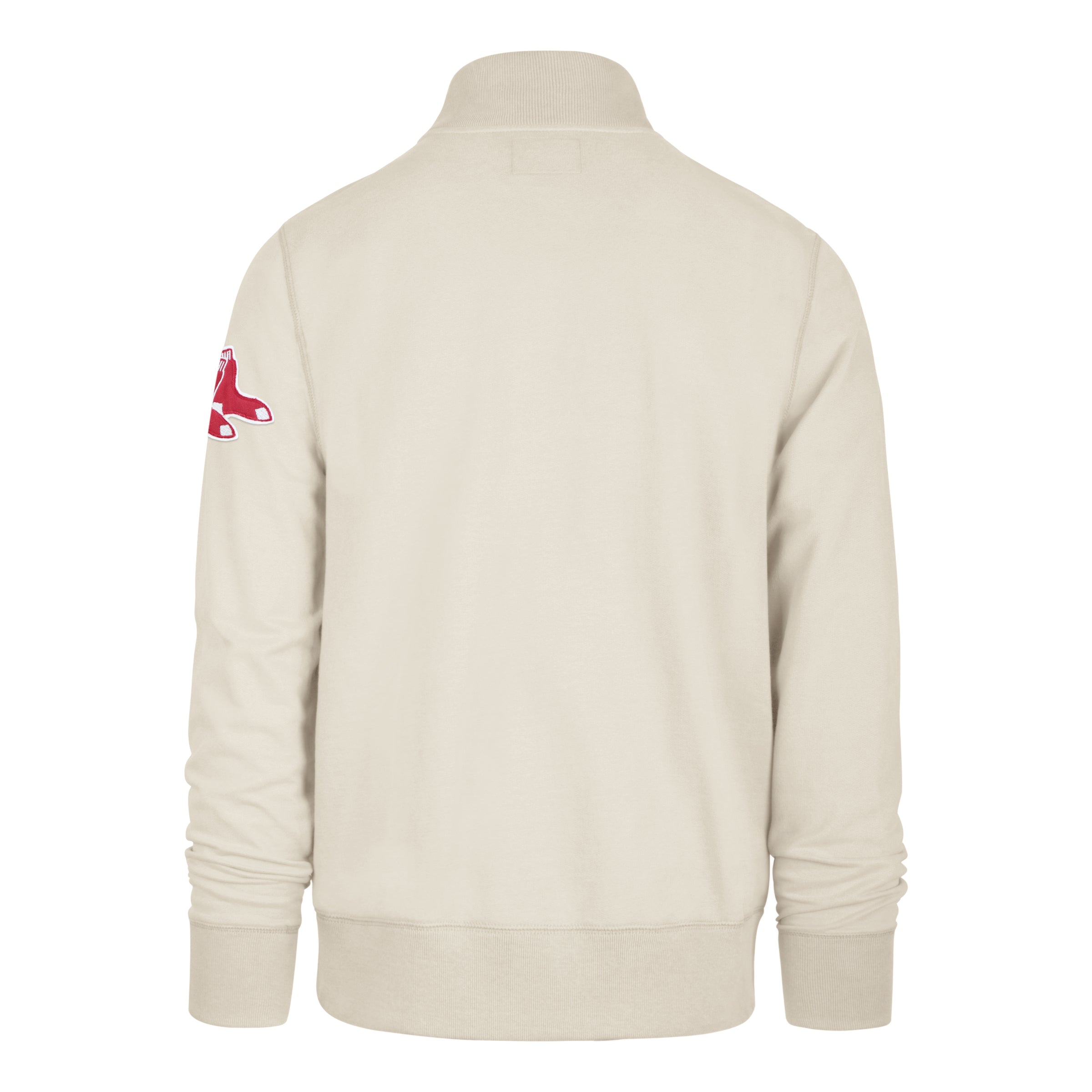 Boston Red Sox 47 Striker 1/4 Zip Sweatshirt - Dune. 47 Brand Boston Red Sox dune sandstone colored 1/4 zip. This is a track jacket style sweatshirt with a two layer hand finished applique of a Red Sox across the chest and the 2 Sox logo on the sleeve. Made with 100% ring spun Peruvian combed cotton, soft Banner wash. Classic fit.