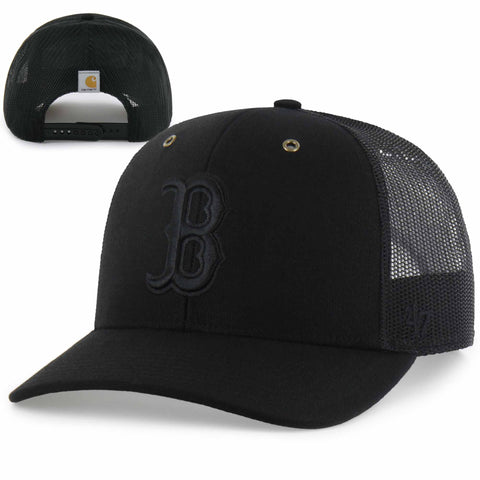 Boston Red Sox Carhartt X ’47 - Clean-Up. The Carhartt ’47 CLEAN UP is our iconic relaxed cap crafted in Carhartt’s signature black duck cloth featuring embroidered logos, brass eyelets, a brown undervisor, an adjustable strap closure, and the iconic Carhartt logo on the back. Carhartt duck cloth, Relaxed fit, Embroidered logo, Brass eyelets, Adjustable strap closure, Brown contrast undervisor, Carhartt logo label on back