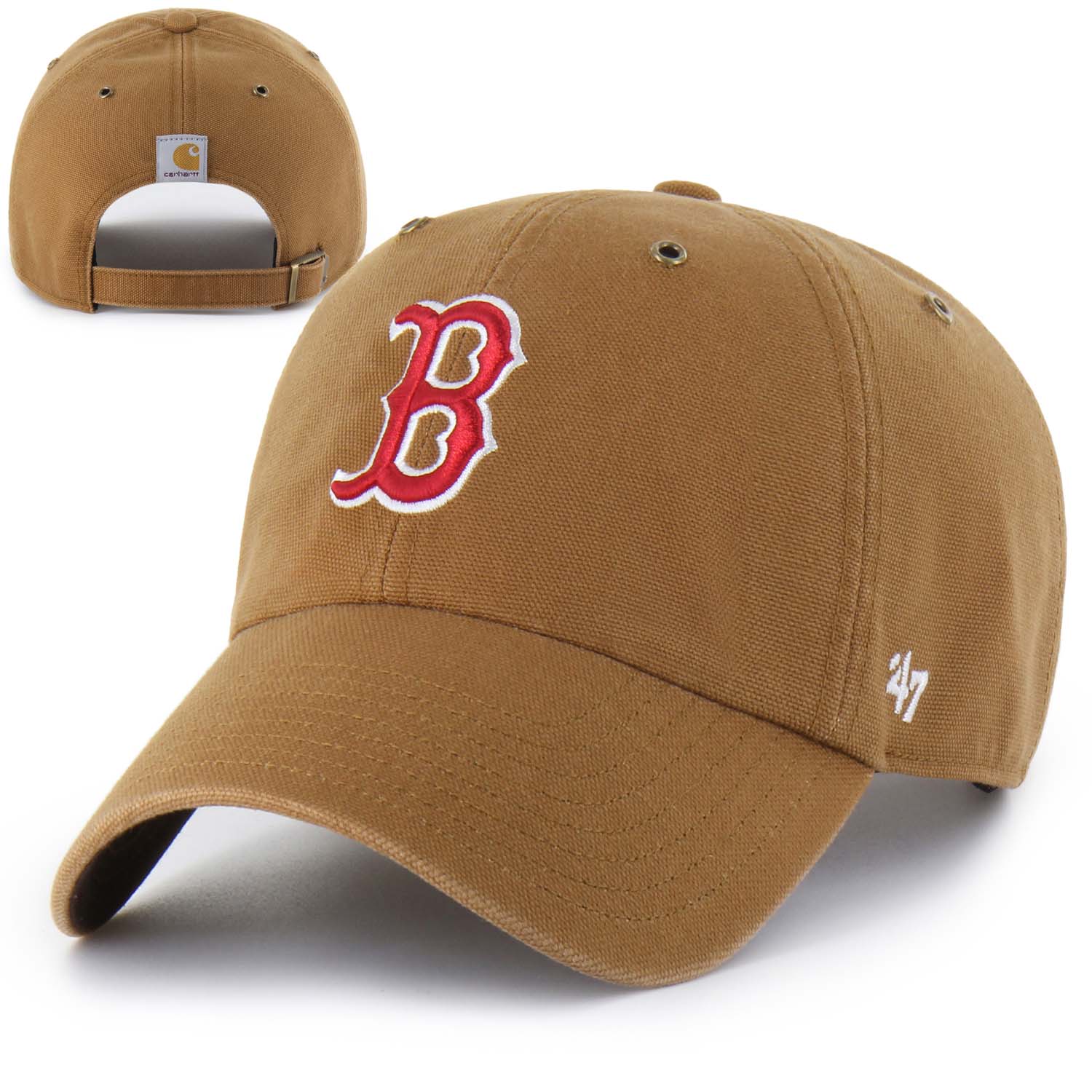 Boston Red Sox Carhartt X ’47 - Clean-Up. The Carhartt ’47 CLEAN UP is our iconic relaxed cap crafted in Carhartt’s signature brown duck cloth featuring embroidered logos, brass eyelets, a brown undervisor, an adjustable strap closure, and the iconic Carhartt logo on the back. Carhartt duck cloth, Relaxed fit, Embroidered logo, Brass eyelets, Adjustable strap closure, Brown contrast undervisor, Carhartt logo label on back