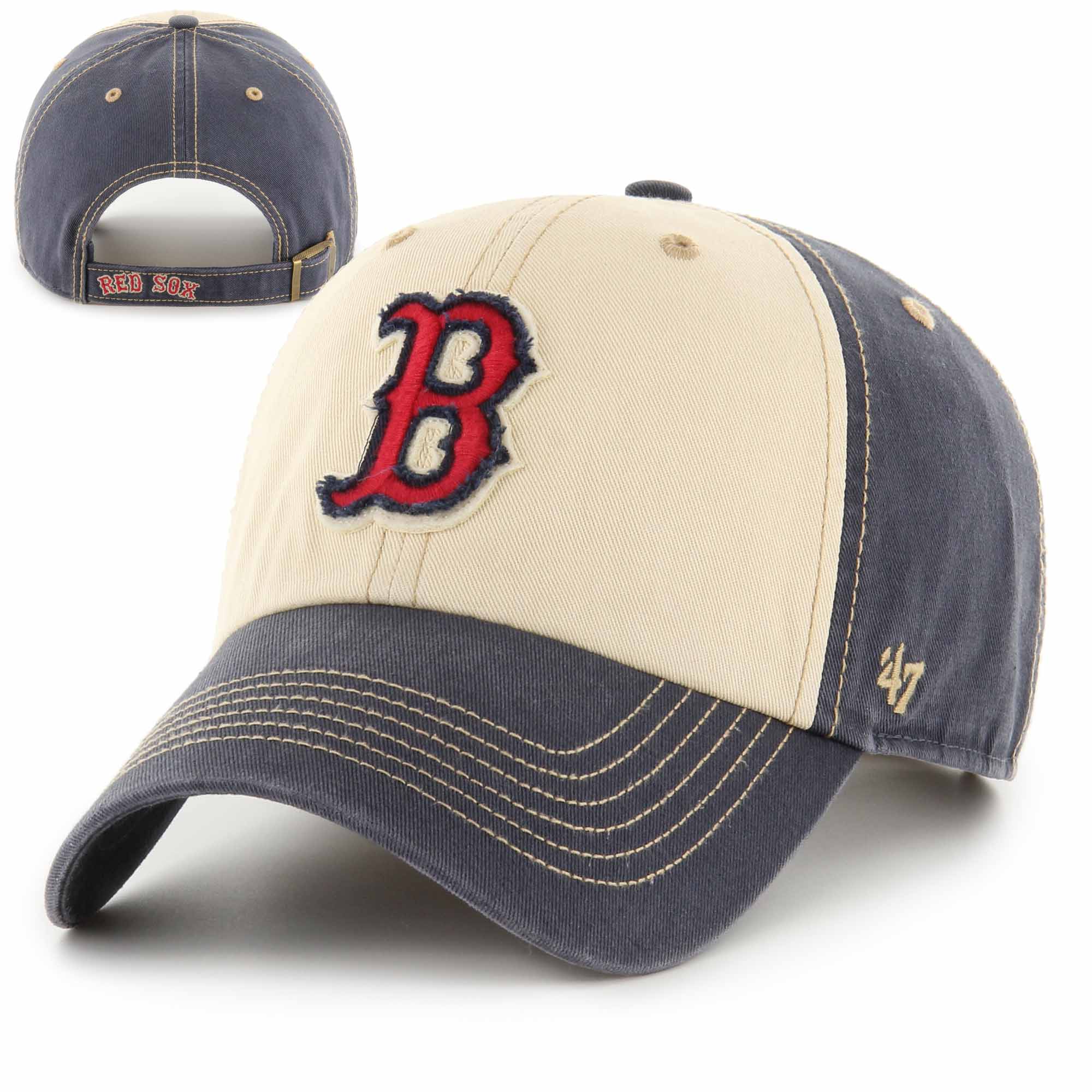 Boston Red Sox 47 Clean-Up - Freshman - Yosemite. The harder working cousin of our Red Sox Clean-Up Freshman. Introducing the Yosemite Freshman Red Sox Navy Hat with Natural front panel. Relaxed fit hat with a white front with a raised tackle twill applique Red Sox B logo, this hat is 100% garment washed cotton for a broken-in look and feel. This hat has a cloth adjustable strap and is one size fits all.