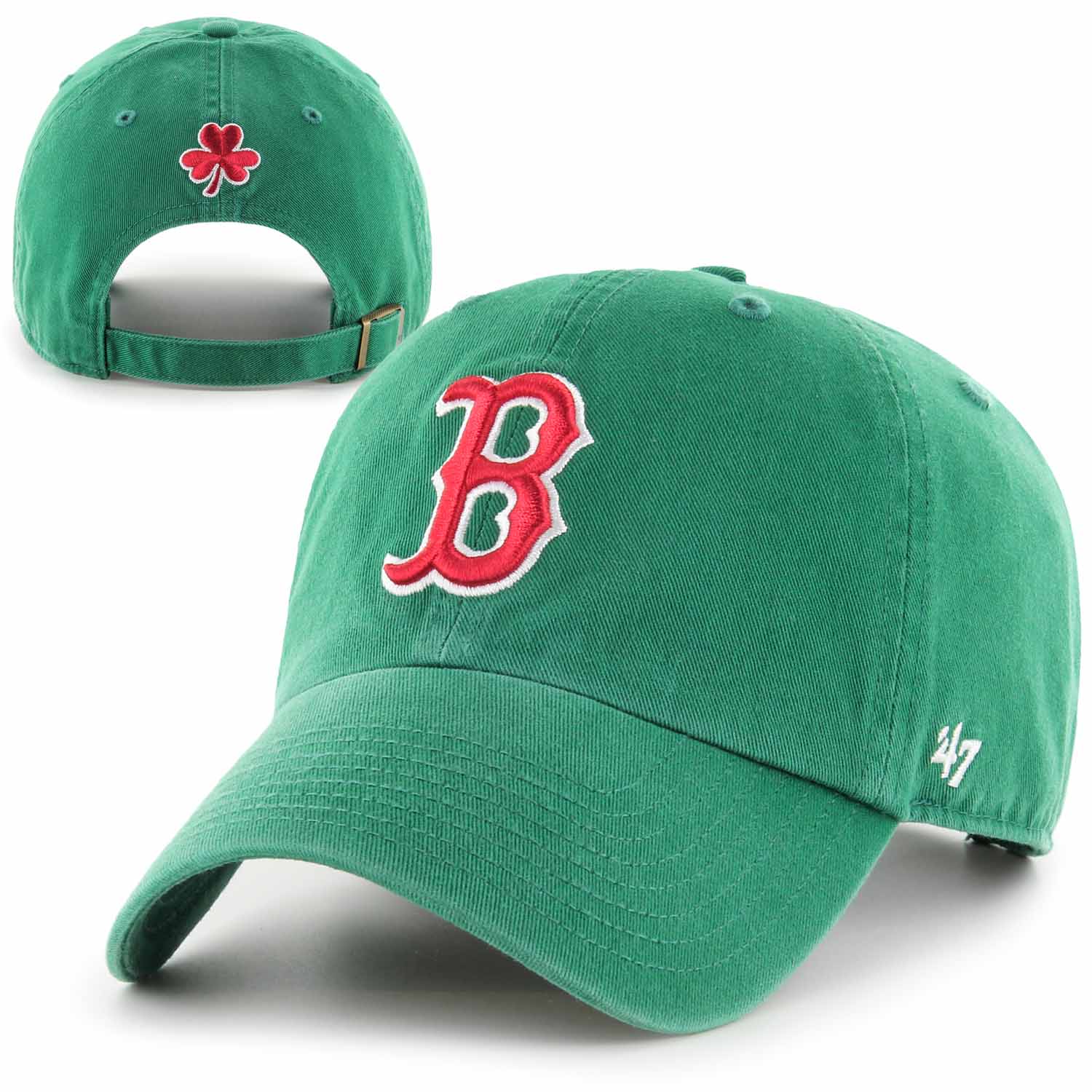 Boston Red Sox 47 Clean-Up - St. Pat's - Kelly Hat. Boston Red Sox St. Pats Kelly Green Hat. Red Sox kelly relaxed fit hat with a raised embroidery B logo and a shamrock on the back, the Classic look for St. Patrick's Day in Boston, or at JetBlue park. This hat is 100% garment washed cotton for a broken-in look and feel. This hat has a cloth adjustable strap and is one size fits all.