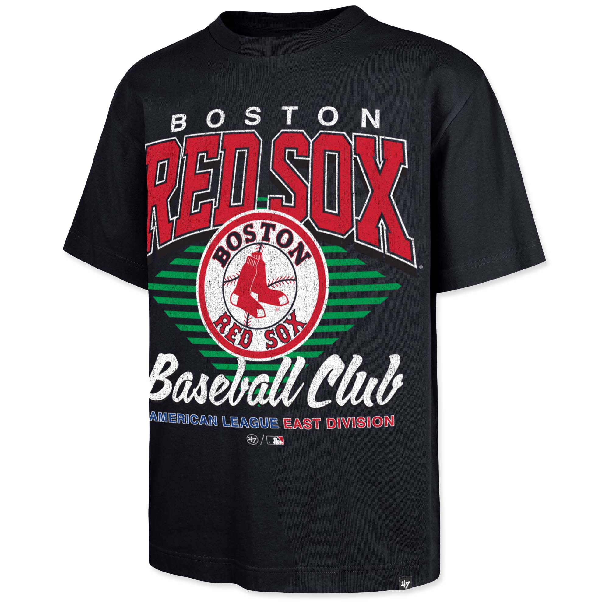 Boston Red Sox Foundation T-Shirt - Extended Play - Navy. The ’47 Foundation Tee is a 100% cotton tee crafted from heavyweight cotton jersey with a sturdier structure that holds its shape featuring bespoke screen-printed graphics. This is an oversized silhouette. 100% heavy weight cotton jersey for a sturdier structure that holds its shape