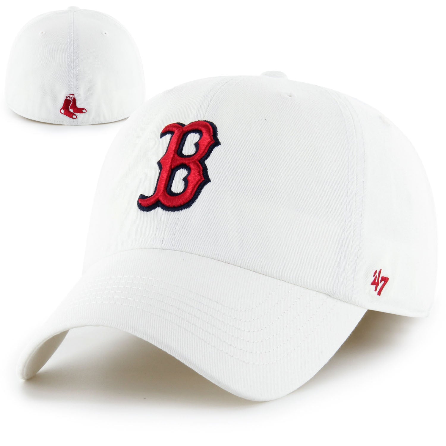 Boston Red Sox 47 Fitted Franchise - White. Classic Red Sox Franchise hat with Red Sox B logo on the front crisp new saturated deep white hat. The '47 FRANCHISE is fitted, relaxed and curved with raised embroidery on the front and flat embroidery on the back. Made from garment washed rPET cotton twill. Fabric is Blend of Cotton and Recycled Polyester, Each cap contains approximately 2 20oz bottles worth of recycled plastic, Cotton Twill Sweatband, Kelly Green under visor