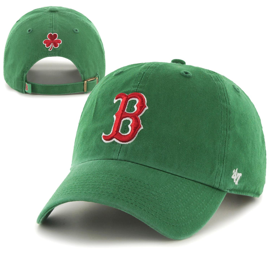 Kids Red Sox cotton garment wash kelly green hat with red "B" logo embroidered on the front with adjustable strap in the back. There is also an embroidered red shamrock on the back.