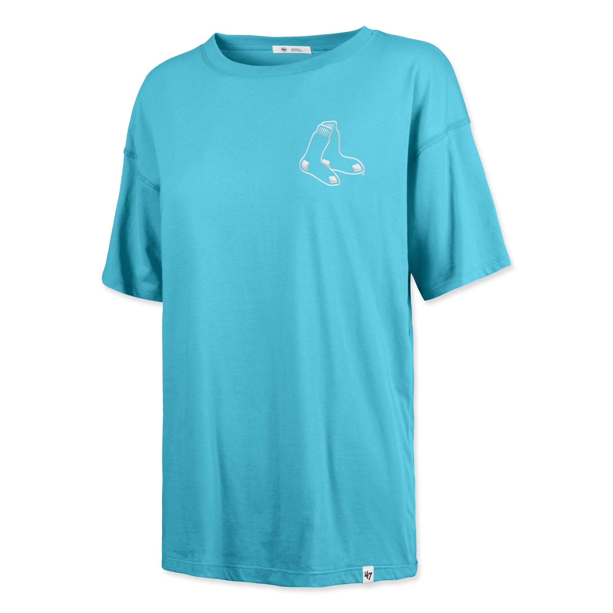 Boston Red Sox Ladies 47 High Spirits Sadie Tee - Caribbean Blue. ’47 Sadie Tee is made from lightweight 100% cotton with a special garment wash process for a lived-in look and feel. This style features a puff print graphic and soft, bright colors for a vintage aesthetic. The 47 Sadie is a contemporary fit - intentionally OVERSIZED for a slouchy fit, with dropped shoulders, slightly longer sleeves and a longer body length.