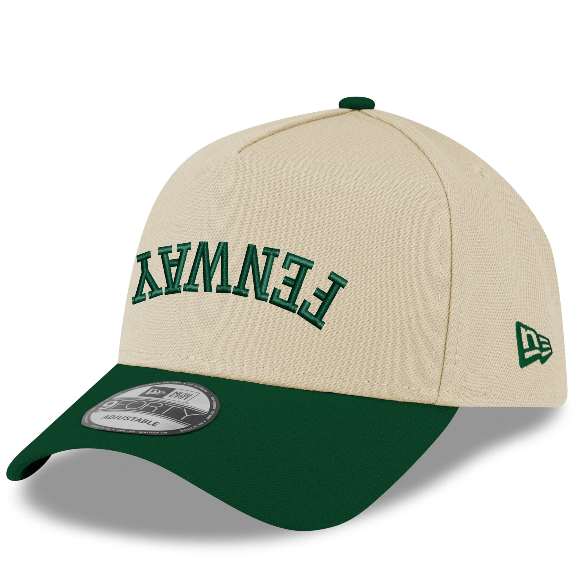 Boston Red Sox New Era 9Forty Upside Down - Fenway Park - Cream/Hunter. The Boston Red Sox 9FORTY A-Frame Snapback features an embroidered Upside Down Boston logo at the front panels with a B logo at the right-wear side. Additional details include a snapback closure at the rear.