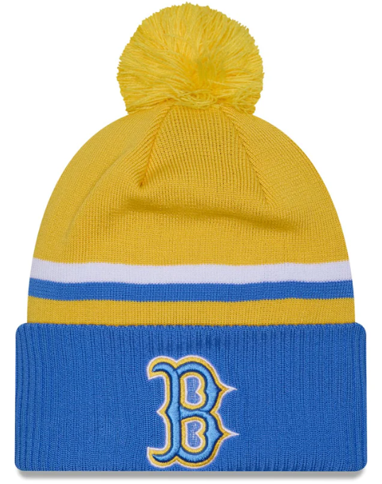 Boston Red SoxNew Era Knit - Pom Knit - Yellow. Jersey inspired, city connected. The Boston Red Sox City Connect Pom Knit draws originality from unique elements tied to the surrounding city and features an embroidered Red Sox logo at the front with a matching MLB Batterman logo at the rear and a one-time removable pom at the top.