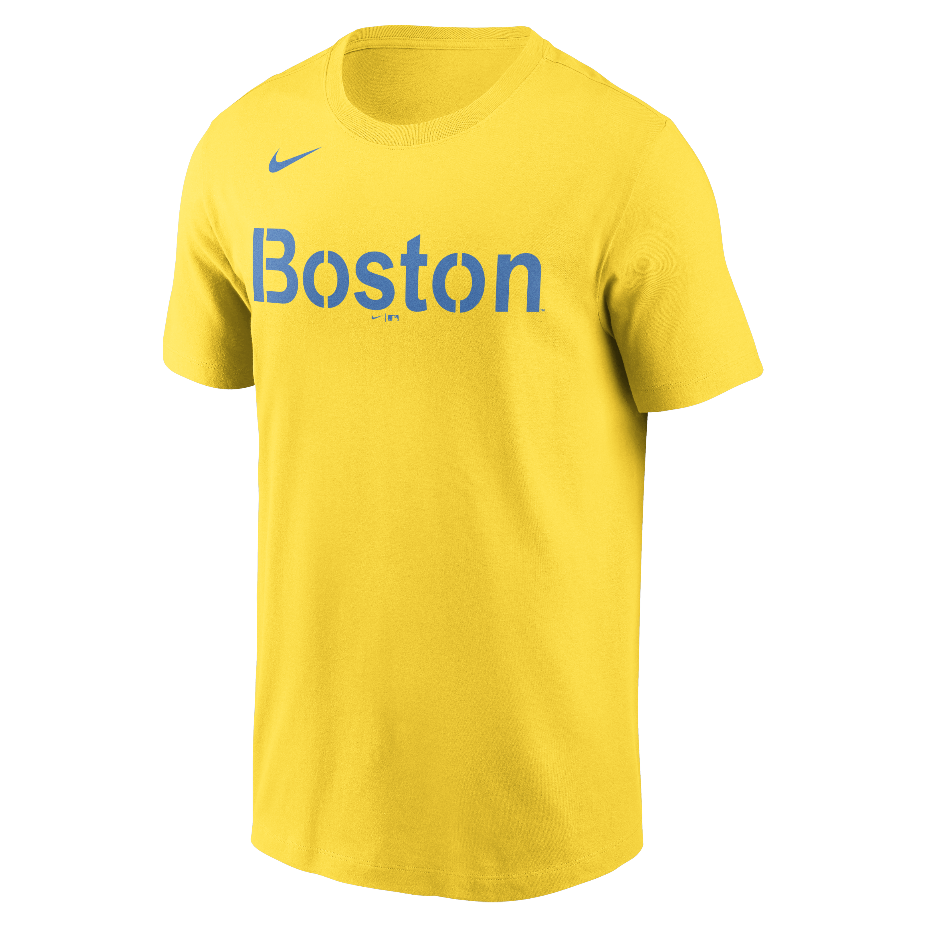 Boston Red Sox Nike City Connect Player T-Shirt Story #10 - Yellow. This basic yellow tee features "Red Sox" screen printed across the chest with "Story #10" on the back. Material: 100% Cotton, Screen print graphics, Crew neck, Short sleeve, Tagless Collar.