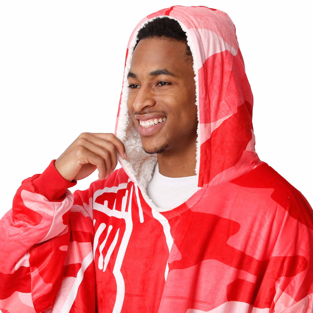 Boston Red Sox Sherpa Hoodeez - Color Camo. Unisex reversible oversized hooded sherpa fleece. You spend your days looking forward to snuggling up and watching your favorite team. Show off your Boston Red Sox spirit while looking good and staying comfortable in this sweet Reversible Sherpa Hoodeez. It features bold graphics on both sides and comfy Sherpa fabric to keep you relaxed and focused on the Boston Red Sox game. Material: 100% Polyester